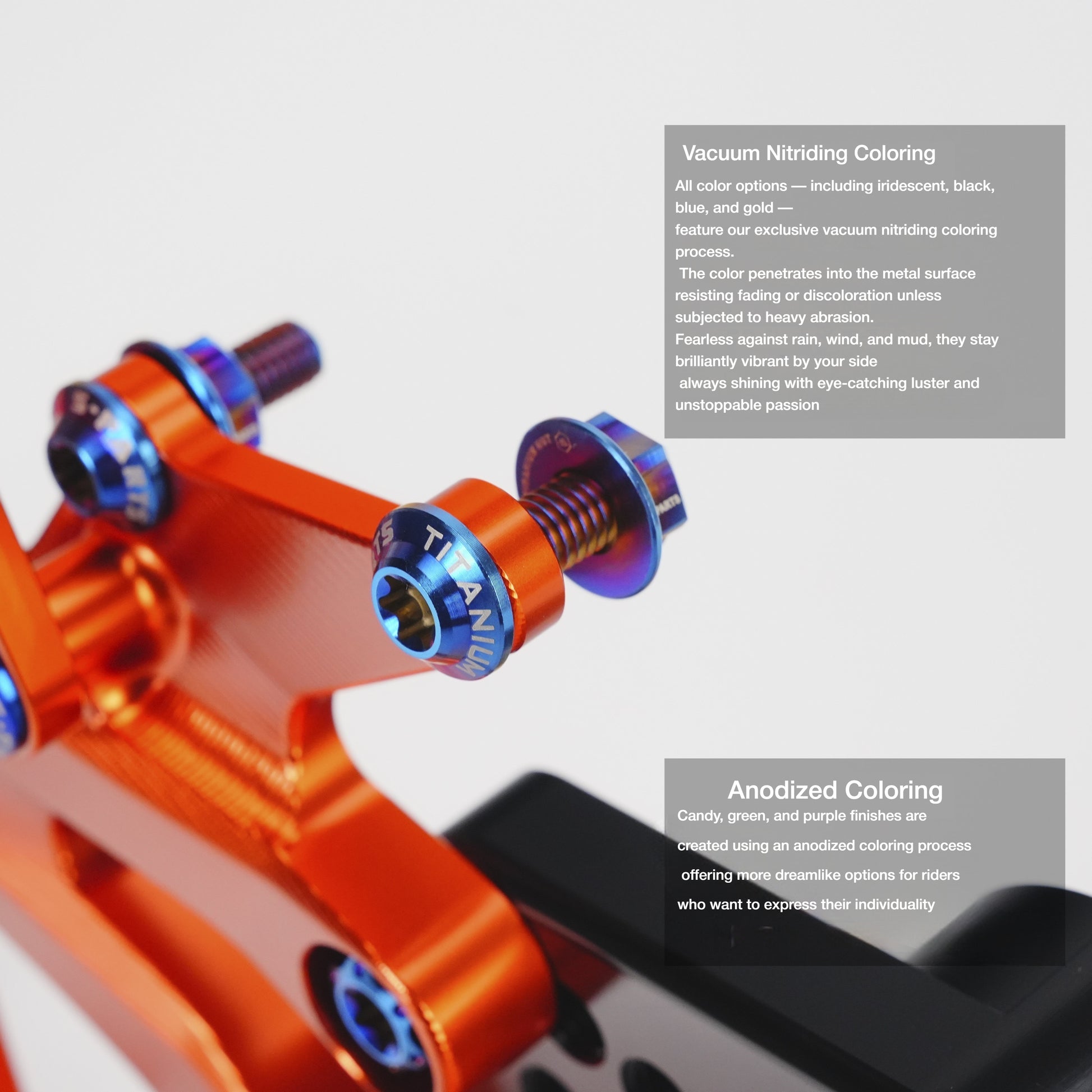 专为 KTM Duke 790 和 MOTO TRON 脚踏增高套件升级而设计,高强度、轻质TC4钛合金,耐腐蚀且颜色稳定的涂层,精密配合,可靠的扭矩保持,这款产品非常适合注重功能性和风格的骑手。